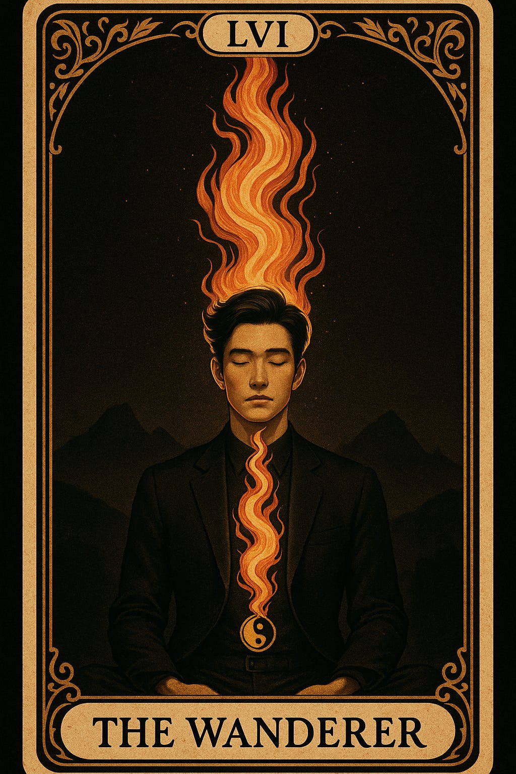 Hexagram 56 tells of a traveler in strange lands. This is not merely a person who has left home, but one who is becoming someone for whom home no longer exists in any familiar form. What began as movement through space becomes a transformation through inner fire. The Zhenren strives not for progress, achievement, or external discovery. He unleashes a dismantling: the gradual burning away of comfort, identity, and place, leaving no longer a self moving through a world, but fire itself, moving from stillness.